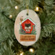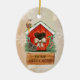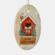 The front of this cute Christmas ornament has an image of a little red birdhouse with a heart entrance embellished with a white bow. On either side of the house are pine boughs, pine cones, and candy canes. A little bird perches on the roof, and a wooden sign that says "Home Sweet Home" hangs on the front. The image is placed on a snowflake bokeh background. The back of the ornament has stylized text that says "Merry Christmas", and several text fields for you to customize.