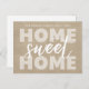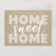 This postcard features a textured look background and bold lettering on the front saying "Home Sweet Home" in shades of white. Use the template form to add your custom text to the front and back of the card. Use the Customise It button to add additional text.