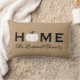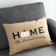 Welcome guests to your home this fall with an inviting personalised lumbar rectangle throw pillow. The simple and stylish typography design features "Home" wording with elegant custom script text for your family name and a white harvest pumpkin accent. Includes a neutral tan, black, white, and green colour scheme.