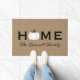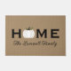 This elegant fall doormat features "Home" in bold black lettering with a chic white pumpkin replacing the "O," paired with your family name in graceful script on a warm rustic tan textured background. The white pumpkin offers a more neutral, modern take on autumn porch decor that transitions beautifully from early fall through Thanksgiving. Family name is fully customizable.