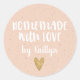 A personalised "homemade with love" sticker with a gold heart on a pink coloured background. Make it yours by adding your own name. A pretty finishing touch for all of your homemade Valentine's Day gifts and other gift giving occasions. Designed for you by Blackberry Boulevard.