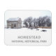 The Palmer-Epard homestead cabin, a small, simple but cosy house, stands on a snow -overed tall grass prairie within Homestead National Historical Park in southeastern Nebraska.