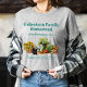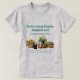 Family farm / homestead business t-shirt. Grey tee with teal green text and fresh picked vegetables and sunflowers design. Personalise with farm name, date established or serving the community, and products offered. Also use the template on the back for address / location, or market location, or delete the sample wording, which will lower the cost. The design contains carrots and other vegetables in a basket next to a watering can. A black kitten crouches next to a basket of sunflowers.