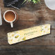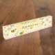 Yellow, white background with a honeycomb pattern. Decorated with light yellow, cream colored tropical florals flowers, hibiscus and happy bumble bees. Templates for a name and title. The name is written with a hand lettered style script. Green letters.