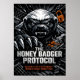 The Honey Badger Protocol delivers a bold, graphic interpretation of one of nature’s most relentless animals. Centered in a high-impact composition, the honey badger lunges forward with claws extended and teeth exposed, breaking through a chaotic backdrop of fractured lines and industrial textures. The sharp black-and-white contrast, combined with controlled orange accents, creates a striking visual that feels inspired by graphic novels and modern action posters.