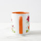 A bright colourful coffee mug decorated with red painted daisies, orange nasturtiums and a honey bee painted in watercolor.