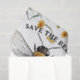 Big illustration of a bee and some yellow and blue flowers with big message "Save the bees" and text with ten tips on how to be bee friendly, perfect for decoupage crafts or gift wrap for bee and nature lover, beekeeper..