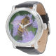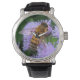 A gold and black honey bee is pollinating the pale violet, blue and purple petals of an ageratum flower on this lovely watch.