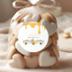 The sticker is made on wonderful paper and had no problem sticking to the bag that I purchased to put it on. I wanted to find a design that would be cute for the bride and groom and this one fit the bill as it has cute "bees" buzzing around and the wedding was taking place in a town called "Bee Cave". The packaging was great and protected the stickers. The website is easy to navigate and there are so many color choices. I had no problem finding a color that the bride was using on everything else selected. The design was adorable and there were many to choose from. You can make the figure as larger or smaller and you can place the photo and writting whereever you want to in the sticker. The printing is fabulous..better than expected.