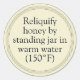 Golden honey jar labels about honey granulation (solidification) with instructions for returning honey to the liquid state: "Reliquify honey by placing jar in warm water (150˚F)". Customise the text for any purpose to use on the top lid or side of glass mason jars, plastic squeeze bottles and other honey containers. Find other stickers for infant warning and nutrition facts in the collection.