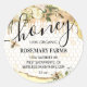 Personalised vintage honey jar stickers to stick on food jars featuring yellow and gold glitter agate crystal edges, a honeycomb background, honey drips, white watercolor florals, bees, and your apiary details.
