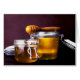 Photograph of two honey jars with a dipper on a purple background. Perfect for Rosh Hashanah.