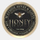 Your apiary name and location is displayed in a curved edged border along the top of label. The word HONEY is written in a beveled metallic font and the text is reflected and faded beneath the word. Honey net weight appears below the label in ounces and grams. Stylised honeybee.