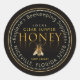 Black Label with the word HONEY written & reflected in metallic gold on black background with double gold and dotted border. Vintage bee outline illustration. Pre-calculated list of honey net weight conversions. Editable text in a curved border for Apiary or Beekeeper's name, and business location.
