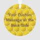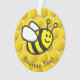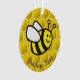Smiling flying bee cartoon over seamless bee-hive background. Custom text on both sides.