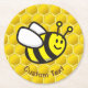 Smiling flying bee cartoon over seamless bee-hive background. Custom text.