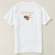 Honey business promotional advertising tee shirt, with artwork of a honeybee inside a leafy wreath, with custom text, above and below it. The back has a single large honeybee and golden yellow text reading We love bees! Personalise for your honey business.