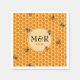 Honeybees over a golden honeycomb pattern to create napkins for a wedding reception or rehearsal dinner, personalised with monogram initials for the bride and groom with an ampersand or plus sign, and the event date in a round frame.