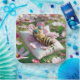 A honeybee relaxes on a pillow made of petals, donning stylish sunglasses amidst a field of blooming flowers