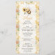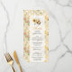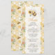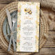 This honeycomb baby shower menu card features a cute bee holding a sunflower, surrounded by floral elements and bees on a warm honeycomb background. The playful and inviting style makes it a perfect personalized table detail.