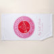 Contemporary, modern, unique vibrant red and magenta pink wedding honeymoon beach towel for newlyweds with monogram - initials, names, place, date, unique romantic love couple birds drawing and trendy handwritten calligraphy script.