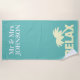Honeymoon beach towels for Mr and Mrs newly weds. Elegant wedding gift idea for just married couples. Teal blue or custom background color with palm tree graphic. Upload your own image optionally. Create one for him and her. Great for summer wedding destinations, beach, pool and more. His and hers presents for new husband and wife.
