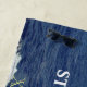 Honeymoon Getaway. Personalise newlyweds first names in white text and wedding date. Honeymoon is written in black script. Getaway and XO is written in cool yellow font. Pretty blue ocean with white foam waves and light blue sky with big fluffy white clouds. Fun keepsake beach towels for the new Mr. and Mrs. Original Photography and Design © TamiraZDesigns.