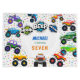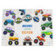 Honk! beep! vroom! monster trucks boy birthday item. Colorful and super cute. Editable name, address.