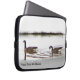 The Canada Goose, Branta canadensis, has a black head and neck, white patches on the face, and a brownish-grey body. The black head and neck with white "chinstrap" distinguish the Canada Goose from all other goose species, with the exception of the Barnacle Goose, but the latter has a black breast, and also grey, rather than brownish, body plumage. The Canada Goose ranges 30 to 43 inches in length and has a 50 to 73 inch wingspan. Males usually weigh 7.1–14 lbs and can be very aggressive in defending territory. The female looks virtually identical but is slightly lighter at 5.5–12 lbs, and has a different honk. The life span in the wild of geese that survive to adulthood ranges 10–24 years Canada Geese are native to North America. They breed in Canada and the northern United States in a variety of habitats. Nests are usually located in an elevated area near water such as streams, lakes, ponds and sometimes on a beaver lodge. Eggs are laid in a shallow depression lined with plant material and down. In recent years, Canada Goose populations in some areas have grown substantially, so much so that many consider them pests for their droppings, bacteria in their droppings, noise, and confrontational behaviour. This problem is partially due to the removal of natural predators and an abundance of safe, man-made bodies of water such as found on golf courses, in public parks and beaches, and in planned communities. Due in part to the interbreeding of various migratory subspecies with the introduced non-migratory Giant subspecies, Canada Geese are frequently a year-around feature of such urban environments. Canada Geese have reached northern Europe naturally, as has been proved by ringing recoveries. The birds are of at least the subspecies parvipes, and possibly others. Canada Geese are also found naturally on the Kamchatka Peninsula in eastern Siberia, eastern China, and throughout Japan. Like most geese, the Canada Goose is migratory with the wintering range being most of the United States. Honking from large groups of Canada Geese flying in V-shaped formation signal the transitions into spring and autumn. In some areas, migration routes have changed due to changes in habitat and food sources. In mild climates from California to the Great Lakes, some of the population has become non-migratory due to adequate winter food supply and a lack of former predators. Canada Geese are primarily herbivores, although they sometimes eat small insects and fish. Their diet includes green vegetation and grains. The Canada Goose eats a variety of grasses when on land. It feeds by grasping a blade of grass with the bill, then tearing it with a jerk of the head. The Canada Goose also eats grains such as wheat, beans, rice, and corn when they are available. In the water, it feeds from silt at the bottom of the body of water. It also feeds on aquatic plants, such as seaweeds. In urban cities, they are also known to pick food out of garbage bins. Adult geese are often seen leading their goslings in a line, usually with one parent at the front, and the other at the back. While protecting their goslings, parents often violently chase away nearby creatures, from small blackbirds to lone humans that approach, after warning them by giving off a hissing sound and will then attack with bites and slaps of the wings if the threat does not retreat or has seized a gosling. Most of the species that prey on eggs will also take a gosling. Although parents are hostile to unfamiliar geese, they may form groups of a number of goslings and a few adults, called crèches.