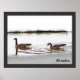 On a grey spring day in Alaska two Canada Geese, often referred to as “honkers,” swim in a body of water still partially choked with ice. Text reading "Alaska" also appears. The Canada Goose, Branta canadensis, has a black head and neck, white patches on the face, and a brownish-grey body. The black head and neck with white "chinstrap" distinguish the Canada Goose from all other goose species, with the exception of the Barnacle Goose, but the latter has a black breast, and also grey, rather than brownish, body plumage. The Canada Goose ranges 30 to 43 inches in length and has a 50 to 73 inch wingspan. Males usually weigh 7.1–14 lbs and can be very aggressive in defending territory. The female looks virtually identical but is slightly lighter at 5.5–12 lbs, and has a different honk. The life span in the wild of geese that survive to adulthood ranges 10–24 years Canada Geese are native to North America. They breed in Canada and the northern United States in a variety of habitats. Nests are usually located in an elevated area near water such as streams, lakes, ponds and sometimes on a beaver lodge. Eggs are laid in a shallow depression lined with plant material and down. In recent years, Canada Goose populations in some areas have grown substantially, so much so that many consider them pests for their droppings, bacteria in their droppings, noise, and confrontational behaviour. This problem is partially due to the removal of natural predators and an abundance of safe, man-made bodies of water such as found on golf courses, in public parks and beaches, and in planned communities. Due in part to the interbreeding of various migratory subspecies with the introduced non-migratory Giant subspecies, Canada Geese are frequently a year-around feature of such urban environments. Canada Geese have reached northern Europe naturally, as has been proved by ringing recoveries. The birds are of at least the subspecies parvipes, and possibly others. Canada Geese are also found naturally on the Kamchatka Peninsula in eastern Siberia, eastern China, and throughout Japan. Like most geese, the Canada Goose is migratory with the wintering range being most of the United States. Honking from large groups of Canada Geese flying in V-shaped formation signal the transitions into spring and autumn. In some areas, migration routes have changed due to changes in habitat and food sources. In mild climates from California to the Great Lakes, some of the population has become non-migratory due to adequate winter food supply and a lack of former predators. Canada Geese are primarily herbivores, although they sometimes eat small insects and fish. Their diet includes green vegetation and grains. The Canada Goose eats a variety of grasses when on land. It feeds by grasping a blade of grass with the bill, then tearing it with a jerk of the head. The Canada Goose also eats grains such as wheat, beans, rice, and corn when they are available. In the water, it feeds from silt at the bottom of the body of water. It also feeds on aquatic plants, such as seaweeds. In urban cities, they are also known to pick food out of garbage bins. Adult geese are often seen leading their goslings in a line, usually with one parent at the front, and the other at the back. While protecting their goslings, parents often violently chase away nearby creatures, from small blackbirds to lone humans that approach, after warning them by giving off a hissing sound and will then attack with bites and slaps of the wings if the threat does not retreat or has seized a gosling. Most of the species that prey on eggs will also take a gosling. Although parents are hostile to unfamiliar geese, they may form groups of a number of goslings and a few adults, called crèches.