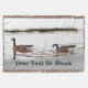 On a grey spring day in Alaska two Canada Geese, often referred to as “honkers,” swim in a body of water still partially choked with ice. Add your own text. The Canada Goose, Branta canadensis, has a black head and neck, white patches on the face, and a brownish-grey body. The black head and neck with white "chinstrap" distinguish the Canada Goose from all other goose species, with the exception of the Barnacle Goose, but the latter has a black breast, and also grey, rather than brownish, body plumage. The Canada Goose ranges 30 to 43 inches in length and has a 50 to 73 inch wingspan. Males usually weigh 7.1–14 lbs and can be very aggressive in defending territory. The female looks virtually identical but is slightly lighter at 5.5–12 lbs, and has a different honk. The life span in the wild of geese that survive to adulthood ranges 10–24 years Canada Geese are native to North America. They breed in Canada and the northern United States in a variety of habitats. Nests are usually located in an elevated area near water such as streams, lakes, ponds and sometimes on a beaver lodge. Eggs are laid in a shallow depression lined with plant material and down. In recent years, Canada Goose populations in some areas have grown substantially, so much so that many consider them pests for their droppings, bacteria in their droppings, noise, and confrontational behaviour. This problem is partially due to the removal of natural predators and an abundance of safe, man-made bodies of water such as found on golf courses, in public parks and beaches, and in planned communities. Due in part to the interbreeding of various migratory subspecies with the introduced non-migratory Giant subspecies, Canada Geese are frequently a year-around feature of such urban environments. Canada Geese have reached northern Europe naturally, as has been proved by ringing recoveries. The birds are of at least the subspecies parvipes, and possibly others. Canada Geese are also found naturally on the Kamchatka Peninsula in eastern Siberia, eastern China, and throughout Japan. Like most geese, the Canada Goose is migratory with the wintering range being most of the United States. Honking from large groups of Canada Geese flying in V-shaped formation signal the transitions into spring and autumn. In some areas, migration routes have changed due to changes in habitat and food sources. In mild climates from California to the Great Lakes, some of the population has become non-migratory due to adequate winter food supply and a lack of former predators. Canada Geese are primarily herbivores, although they sometimes eat small insects and fish. Their diet includes green vegetation and grains. The Canada Goose eats a variety of grasses when on land. It feeds by grasping a blade of grass with the bill, then tearing it with a jerk of the head. The Canada Goose also eats grains such as wheat, beans, rice, and corn when they are available. In the water, it feeds from silt at the bottom of the body of water. It also feeds on aquatic plants, such as seaweeds. In urban cities, they are also known to pick food out of garbage bins. Adult geese are often seen leading their goslings in a line, usually with one parent at the front, and the other at the back. While protecting their goslings, parents often violently chase away nearby creatures, from small blackbirds to lone humans that approach, after warning them by giving off a hissing sound and will then attack with bites and slaps of the wings if the threat does not retreat or has seized a gosling. Most of the species that prey on eggs will also take a gosling. Although parents are hostile to unfamiliar geese, they may form groups of a number of goslings and a few adults, called crèches.