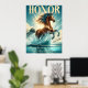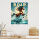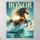 A stunning chestnut horse, mane flowing, charges through clear turquoise water, radiating strength and beauty. Sunlight glistens off the splashes, creating a dynamic and vibrant scene set against a tranquil blue sky with gentle clouds. At the top, "Honour" stands boldly in elegant yellow script, symbolising dignity and courage. Beneath the horse, Aristotle's inspiring quote — "Dignity does not consist in possessing honours, but in deserving them." — is gracefully displayed in yellow font, with his name in smaller print. Framed by sleek black borders, this poster celebrates freedom, strength, and resilience.