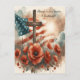 This heartfelt watercolor design features a solemn battlefield cross surrounded by blooming red poppies and gently waving American flags. Radiating sunbeams and soft clouds in the background symbolise peace, remembrance, and eternal honour. The palette of terracotta reds, dusty olive greens, and denim blues offers a warm farmhouse Americana aesthetic. A powerful tribute to those who gave all.