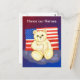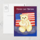 Cream colour teddy bear sits against American flag. He has a tear in his eye and holds paw to heart. Lightning in background. illustration by T.A.Paxton of Starhorsepax, Lightning brushes by obsidiandawn.com. A handy postcard to send a friend in honour of any national holiday honouring American heroes.