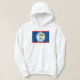 This hooded sweatshirt prominently displays the design of the Belizean flag, chraacterised by its royal blue background with a central red stripe adorned with the national coat of arms. The coat of arms includes a shield with symbols representing the country's origins and natural resources, supported by two woodcutters in front of a mahogany tree.