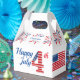 Hooray for the red, white and blue. Celebrate the Fourth of July with this Patriotic favour box. The box has a white background with a band fireworks, at the top. The message in the front and back panels reads "Happy Fourth of July". The side panels have an American flag,