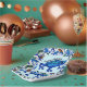 Complete your frog or tropical rainforest themed party with these decorative plates. Design features a pattern of various blue, green, and orange poison dart frogs with a blue frog featured and the words, "Hop-py Birthday"