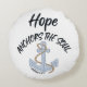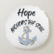 This round pillow showcases a unique black bones print font with black letters light blue outline plus bible citation displaying the words "Hope Anchors The Soul" with a light blue anchor icon with rope underneath in this bible based quote theme. This pillow is made with high quality fabric our pillows are soft and wrinkle-free the cover is machine washable.