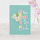 This card features a stylised cross centred on an aquamarine background, built from textured rectangular pieces in soft spring pastels like lavender, pink, sky blue, and buttercup yellow. The mosaic look gives the shapes a gentle, close-together feel, like parts leaning in as one. On the left arm of the cross sit two star-shaped blossoms with white petals that appear softly lit, suggesting a tender, caring touch. Their green stems and small buds curve upward, and the golden-yellow centres echo the warm tones in the cross. To the right side, the text “Hope… the spirit of Easter” appears in white, placed at mid-height so it balances the cross without crowding it. The lighting stays soft and even, with pastel colours that keep the scene calm while still feeling affectionate and welcoming 🌷. Near the blossoms, tiny highlights make the petals look gently glowing 🐇.