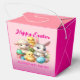 Add a lighthearted touch to Easter parties with this colourful Easter takeout style favour box, which features an adorable AI-generated bunny, lamb, and pair of chicks painting Easter eggs in a spring meadow, accompanied by the punny expressions "Hoppy Easter" and "Blessed may ewe be!" Customise messaging as desired. Reverse shows identical design.