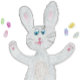 5x7 portrait greeting card – Hoppy Easter! A big grey bunny is hopping in the air, flinging treats. He's very happy to wish the recipient a Hoppy Easter. Original drawing is coloured pencil on paper, scanned in and placed on the card.