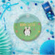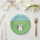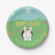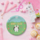 Fun paper plate featuring a funny white bunny that pops out from his rabbit hole with the word pun Hoppy Easter