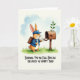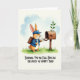 This card shows a friendly, human-like rabbit delivering mail, dressed in a blue jacket over a white shirt with a matching blue cap, its soft orange fur and gentle smile aimed toward the open mailbox as if sharing a sweet note with someone special 🐰. One paw slides a small white letter into the slot while the other steadies the mailbox door, giving the moment a caring, between-friends kind of tenderness. A sturdy brown satchel sits on its back, adding to the tidy, on-duty look. The scene is set on fresh green grass under a pale blue sky with light clouds, keeping the background calm and airy 🌷. A tiny green sprout grows from the top of the rustic brown mailbox, hinting at springtime arriving. Centered beneath the illustration, the message “SENDING YOU AN EGG-SPECIAL DELIVERY OF HOPPY MAIL!” appears in thick, decorative lettering in a dark tone that stands out against the light space. The mailbox is a warm brown with an open lid, and the little sprout is a bright green tuft at the very top.