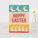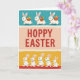 This design shows a three-panel scene with long-eared white rabbits moving through a springtime setting 🐇. In the top panel, three matching rabbits walk side by side on a teal background, each holding a woven basket filled with speckled eggs and small flowers 🌷. Their gentle forward tilt and close spacing suggest they’re delivering gifts together, like close friends sharing a quiet mission. Across the middle, a wide peach-coloured banner carries the words “HOPPY EASTER” in chunky red lettering centred prominently. The bottom panel shows five rabbits in a marching line, getting smaller from left to right to create depth, as if they’re heading towards one another in the distance. Each rabbit wears a different bright neck tie, adding a sweet, affectionate touch to their coordinated walk. They step along a red ground strip beneath a golden-yellow sky, with a soft grainy texture visible across the colours.