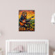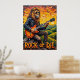 This imaginative artwork showcases a lion, a true rock star with sunglasses and a leather jacket, unleashing "wilderness strums" on an electric guitar from a prominent rock. Its stage is a vast landscape of green hills and scattered trees, bathed in the dramatic light of a setting sun. The bold, textured strokes give a raw, energetic feel, perfectly capturing the "Rock or Die" attitude of this unexpected wilderness performance.