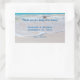 Large horizontal, wedding wine labels with a tropical theme of beach sand and blue water. Use on favours at the reception and personalise the four areas of template text to customise with the bride's and groom's names, a short thank you message, wedding date and name of wine or spirits at the bottom.