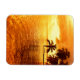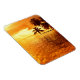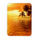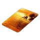 Vertical souvenir photo magnet with a horizontal palm tree hanging over the water of the pacific ocean during sunset on a tropical island.