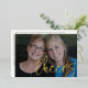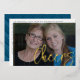 A gold foil greeting - cheers - is on top of the photo in a large, trendy script font. The photo is off-centre, and the family signature wraps around the white border. A gold border accent is also included. ---