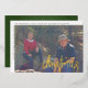 A gold foil greeting - merry christmas - is on top of the photo in a trendy script font. The photo is off-centre, and the family signature wraps around the white border. A gold border accent is also included. ---