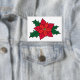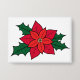 Horizontal rectangle button pin with a Christmas red poinsettia, with dark green leaves and a black outline